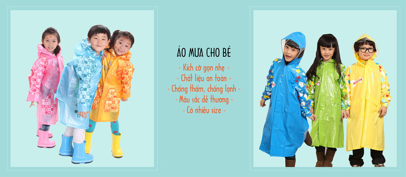 - Áo mưa trẻ em: Mẫu áo mưa trẻ em có họa tiết sặc sỡ, màu sắc bắt mắt, phù hợp với sở thích của trẻ nhỏ. Chất liệu áo chống thấm, bảo vệ bé yêu dưới trời mưa.